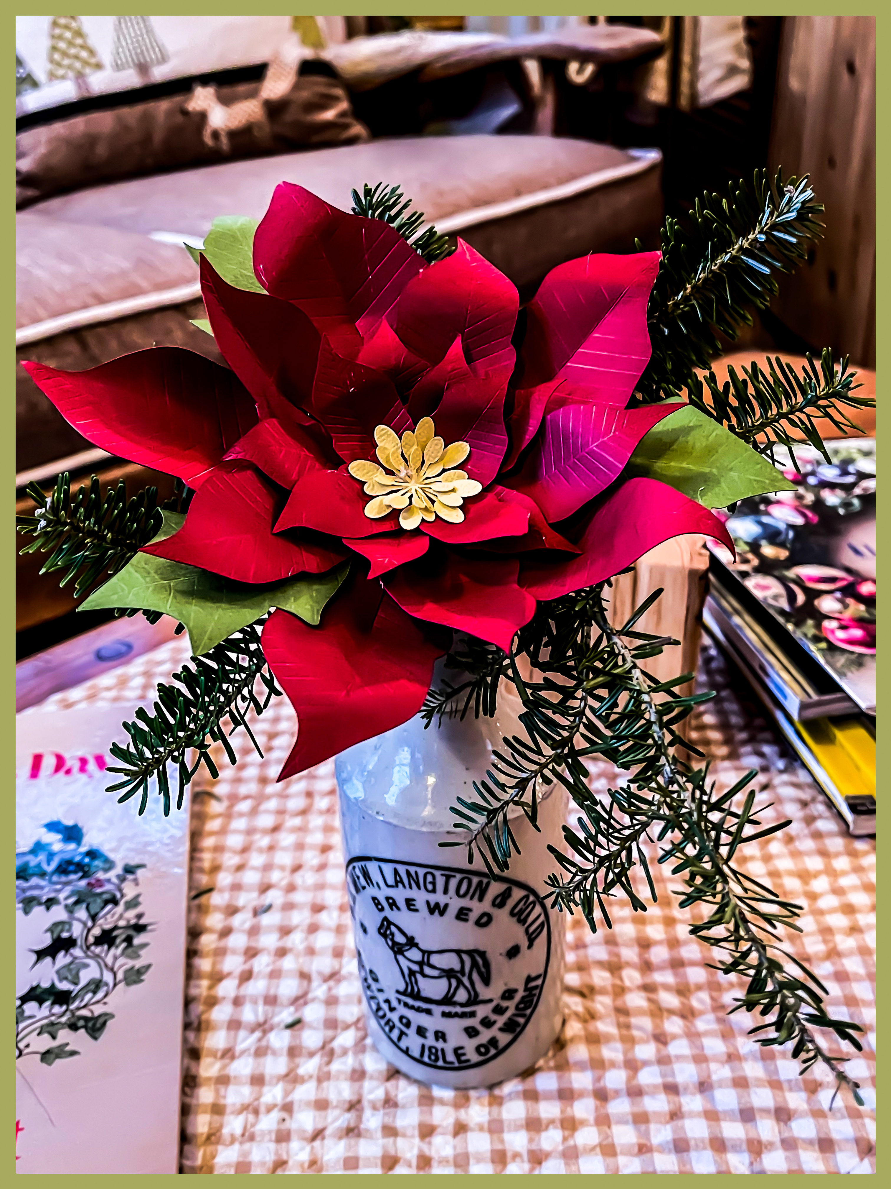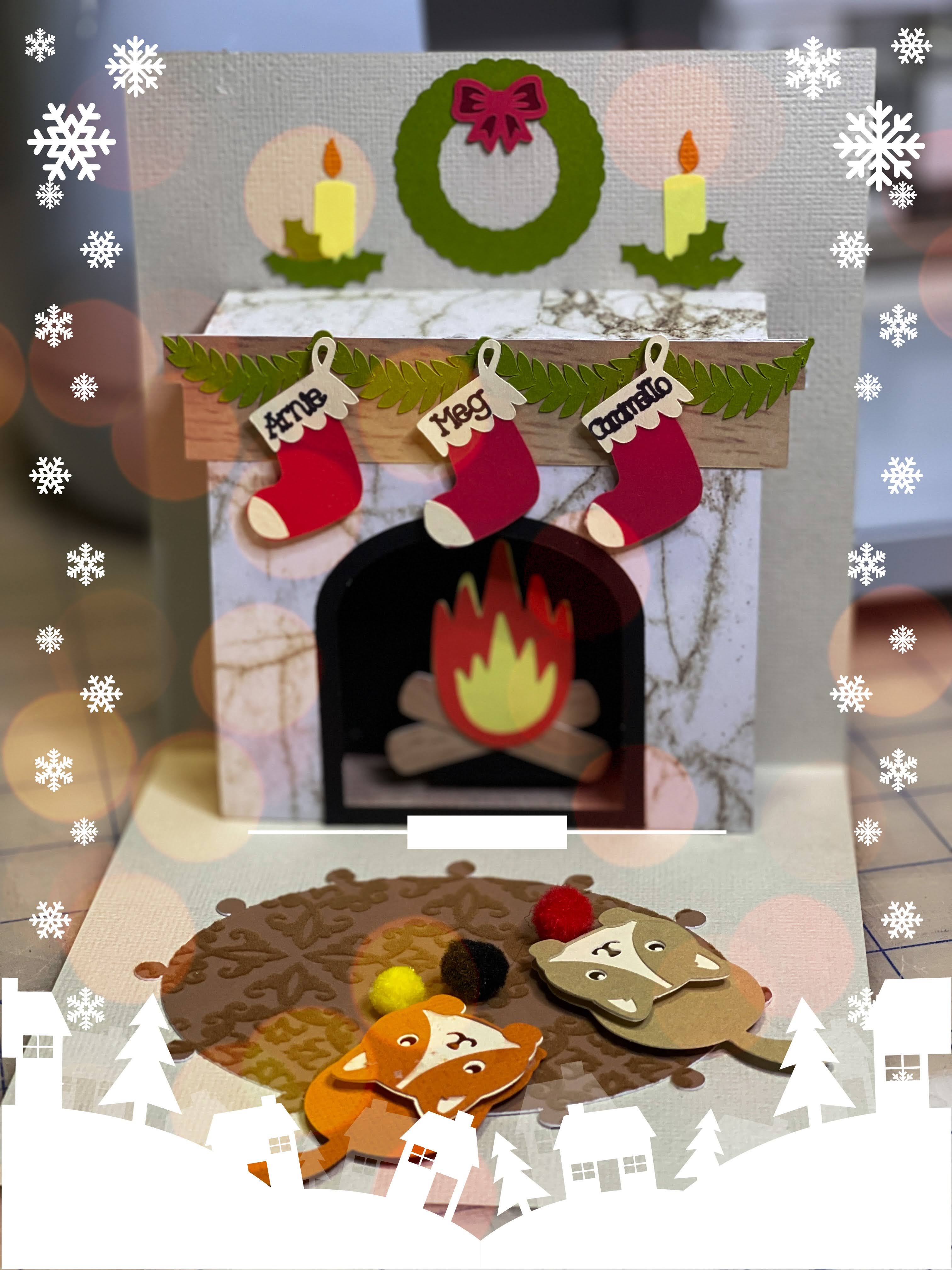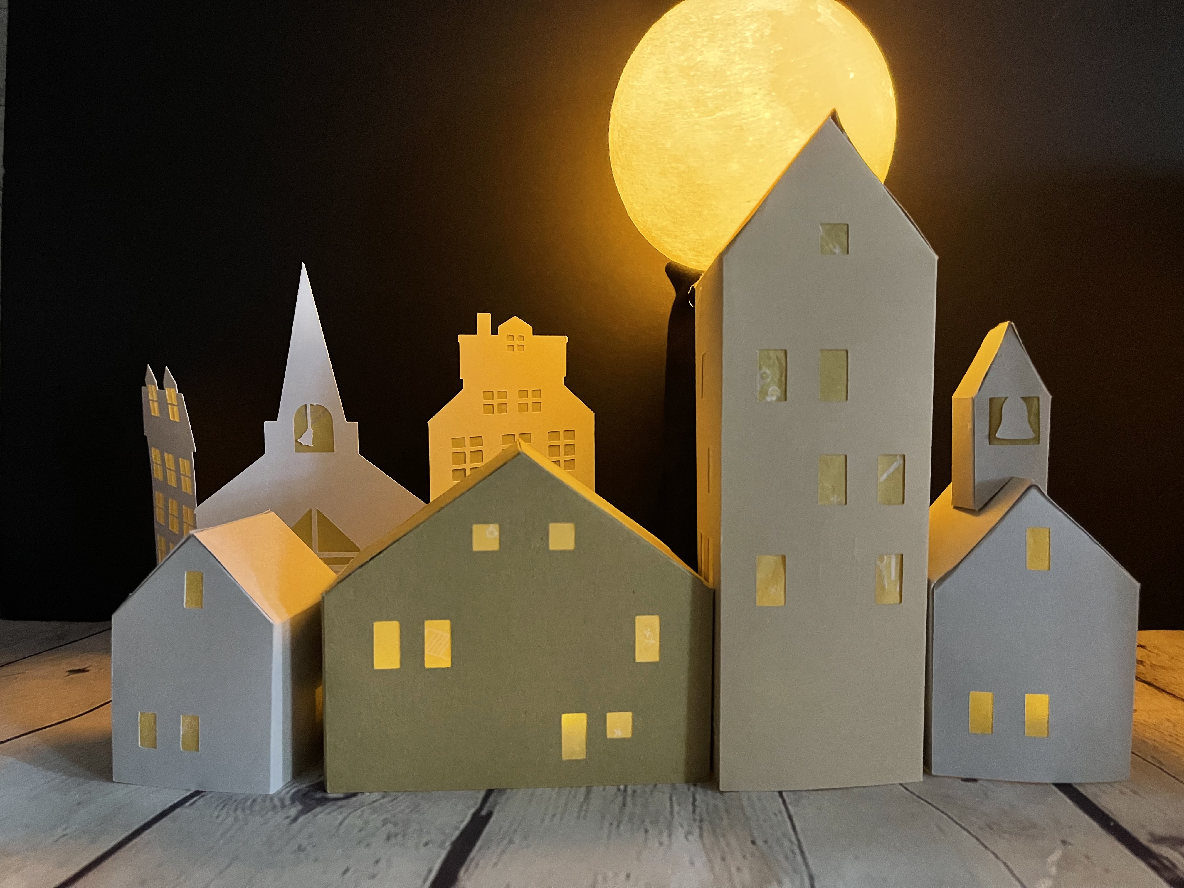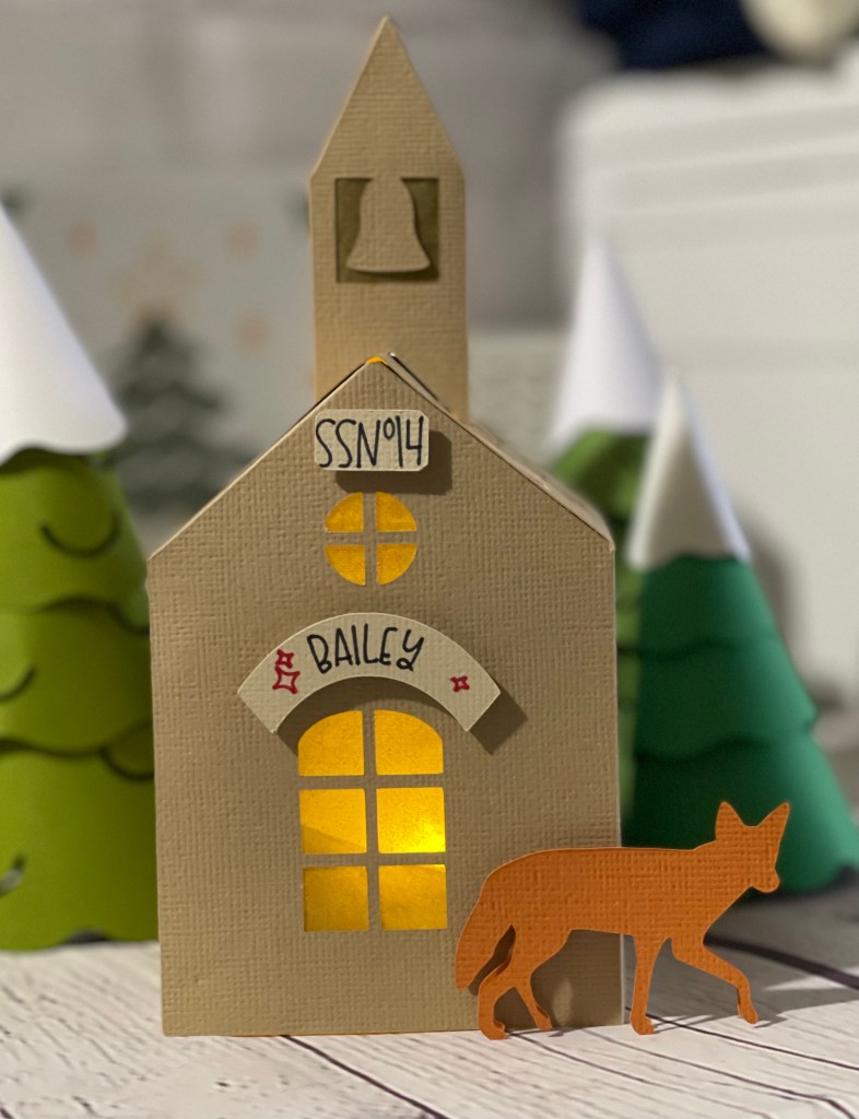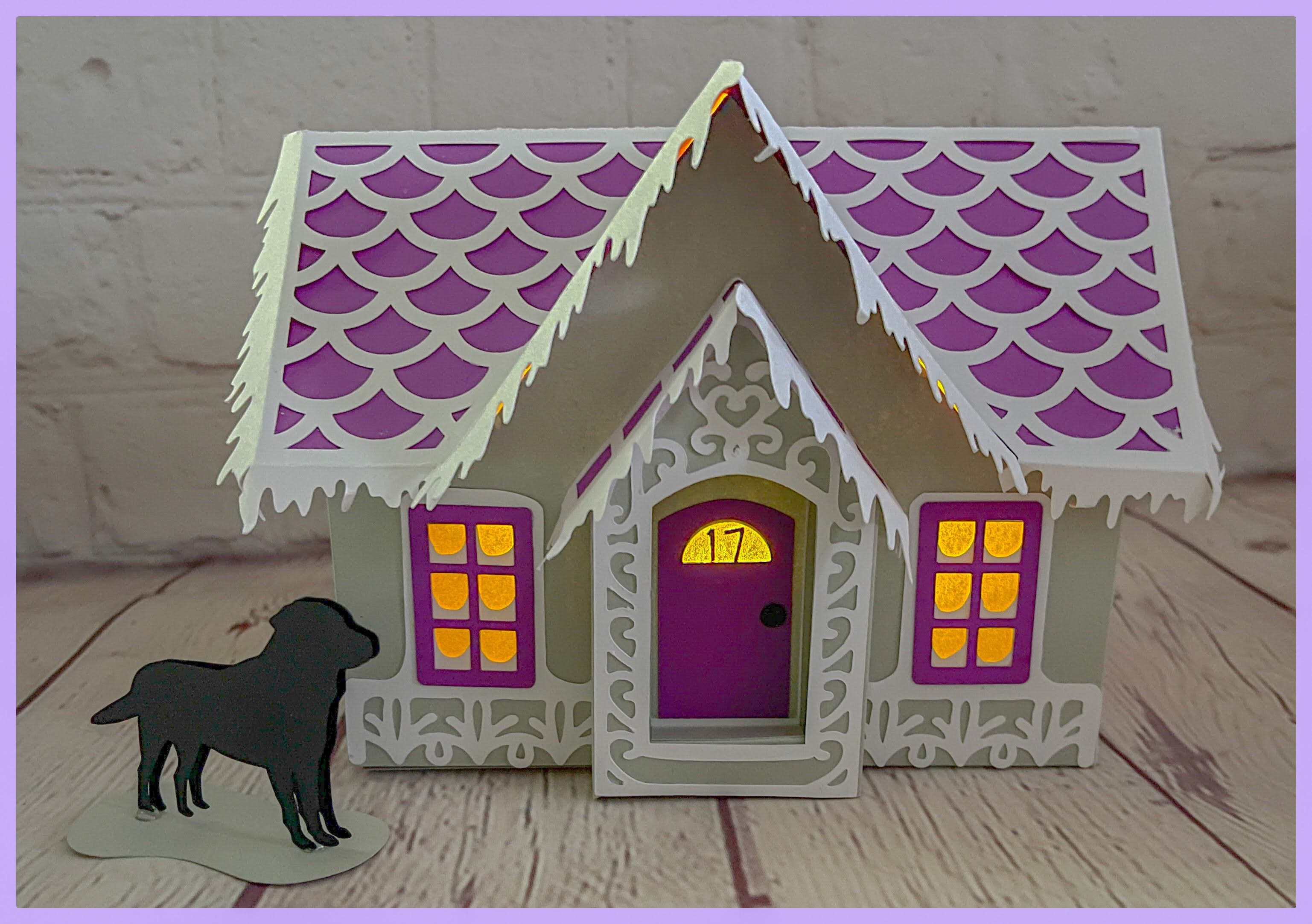A new favourite of mine since my Cricut life began… the paper house. Well, card stock actually. The little windows are lined with tissue paper and a battery operated tea light with timer is set inside to make it glow. A group of buildings with backdrops makes a cozy display at Christmas. Meg made a set, too.