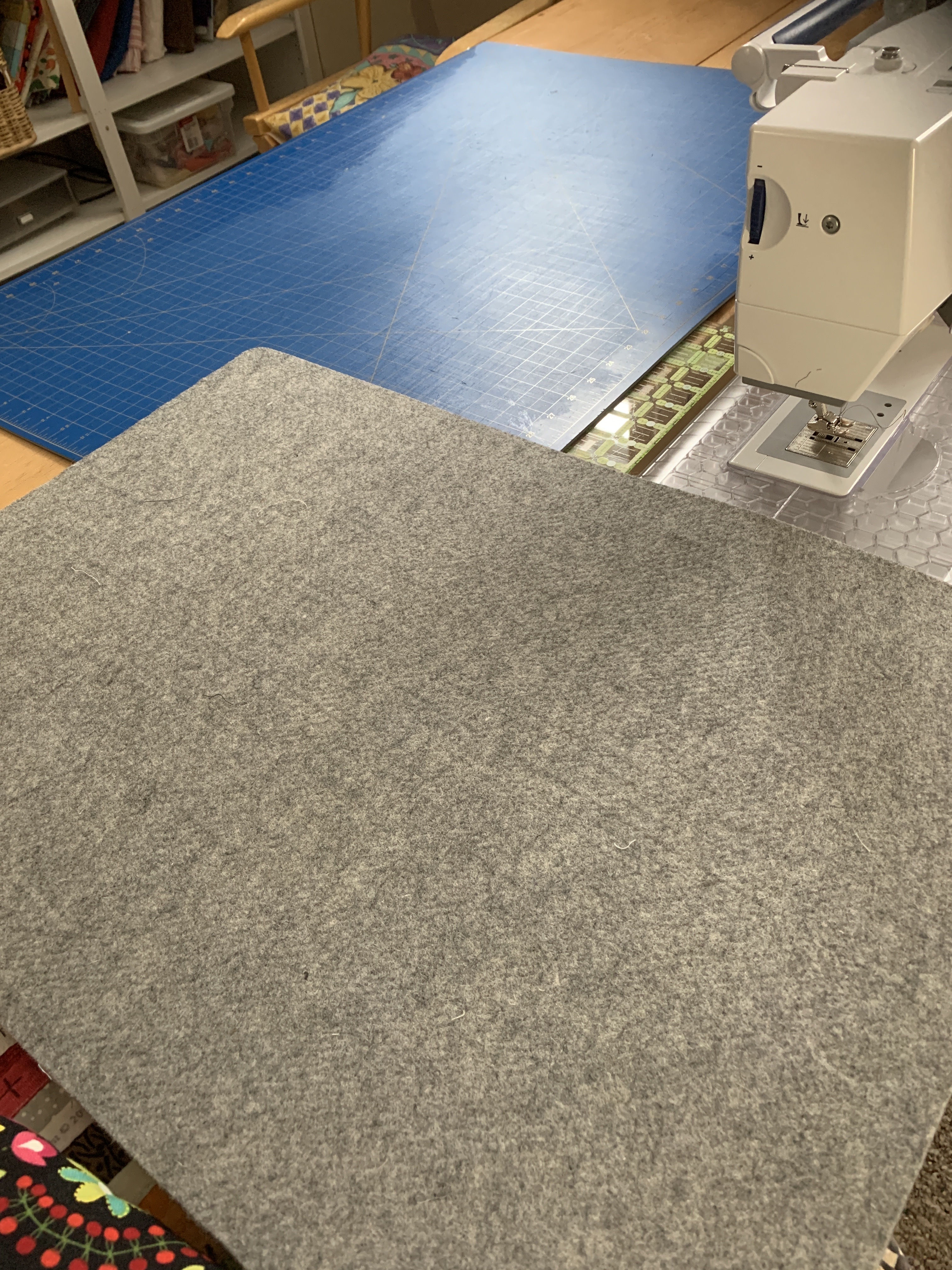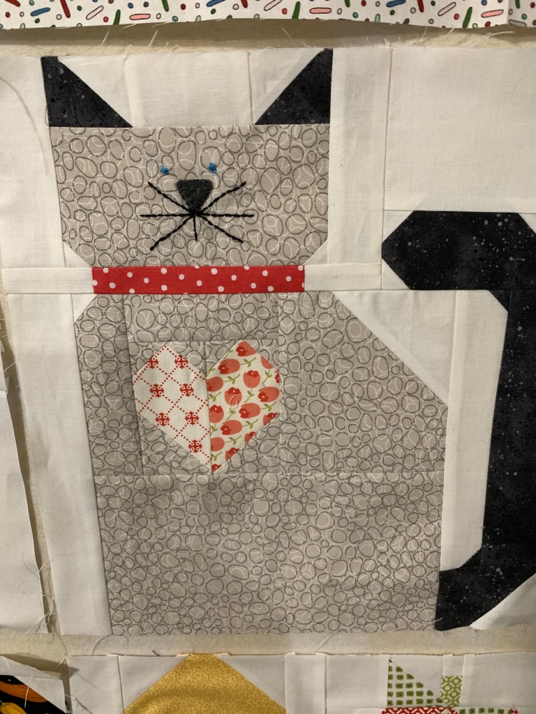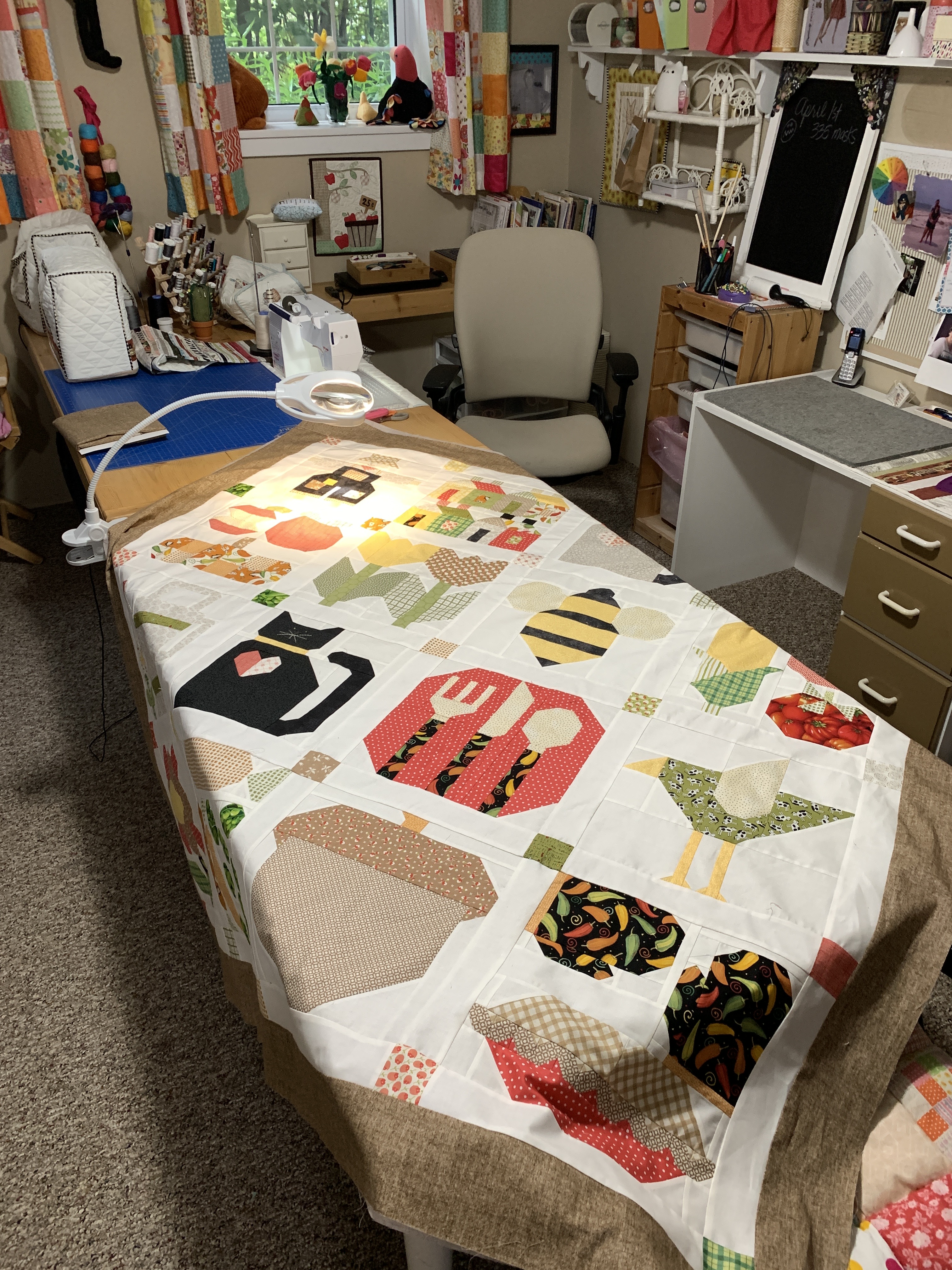Here is Mark’s quilt in the prep stage. Mark’s quilt tells this story: He likes to garden when not designing houses and this year is growing yummy this to eat like tomatoes, peas, beans, zucchini and swiss chard.. He has 2 apple trees, devoured by caterpillars this year, and is constantly battling bugs and the shade of the oak trees to get his garden to grow while thinking of Buddy, sniff, (though he is now quite fond of Shadow, too.) Zoom in on the bird to get a hint for one of the types of birds that visits at our feeder. (humour me)
