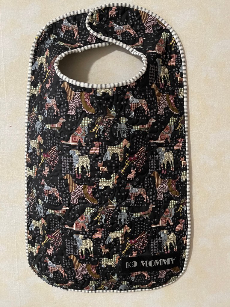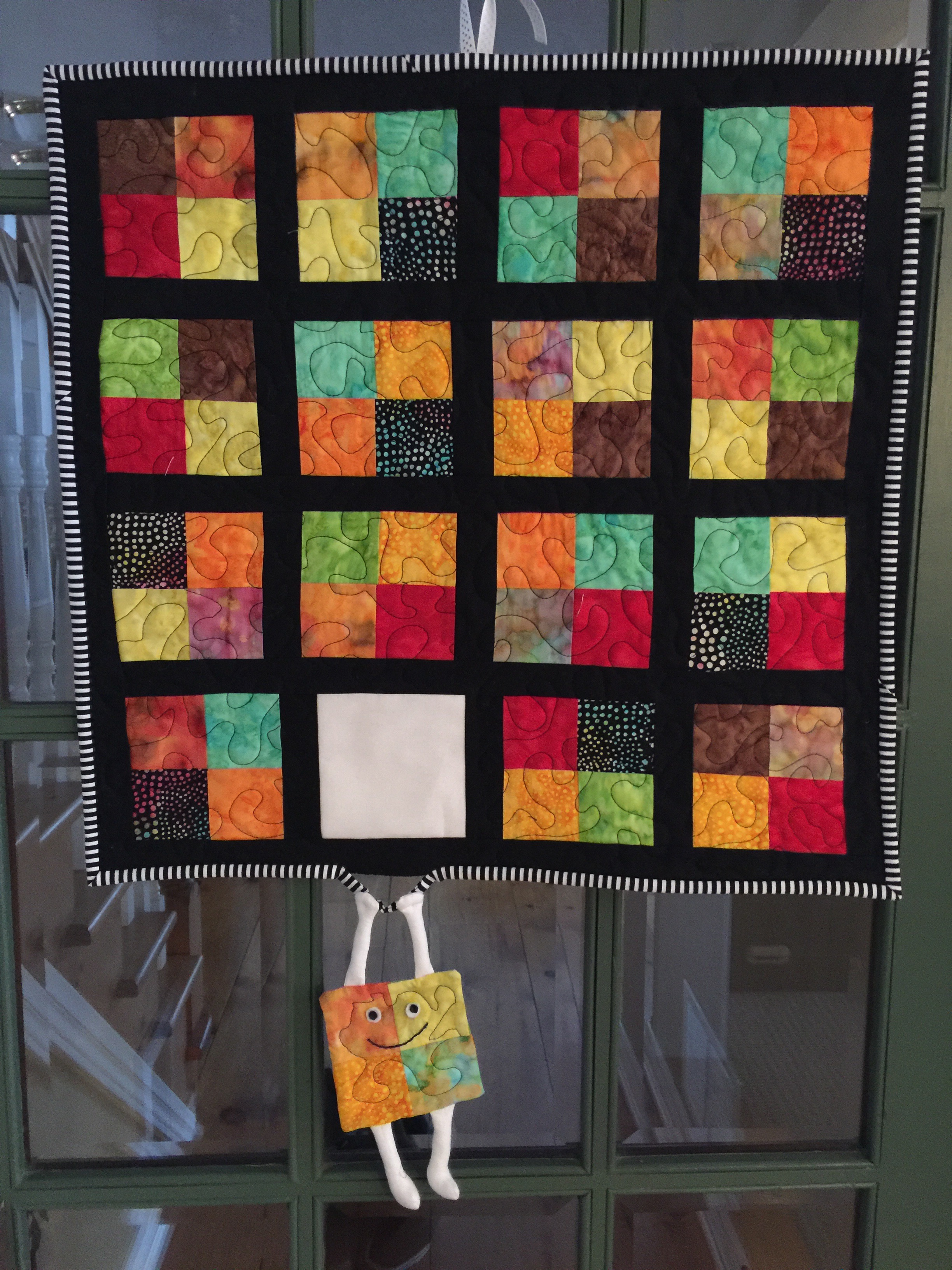It is made of beautiful Batiks with black cotton sashing and backed in flannel. I used mostly black thread for SITD quitting on all the sashing (a real pain, but walking foot helped) and created and used a flower template for some free motion flowers in the big squares. Shadow approves and that’s all that matters.