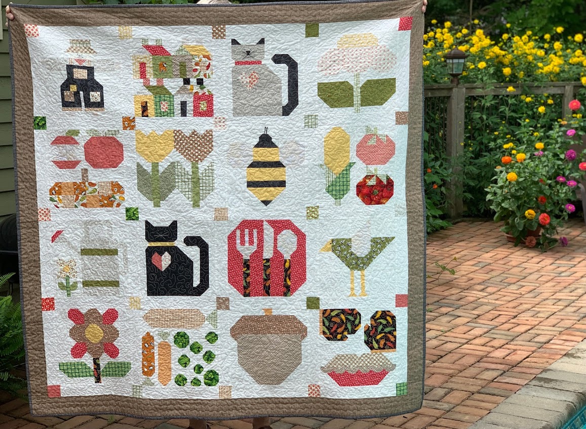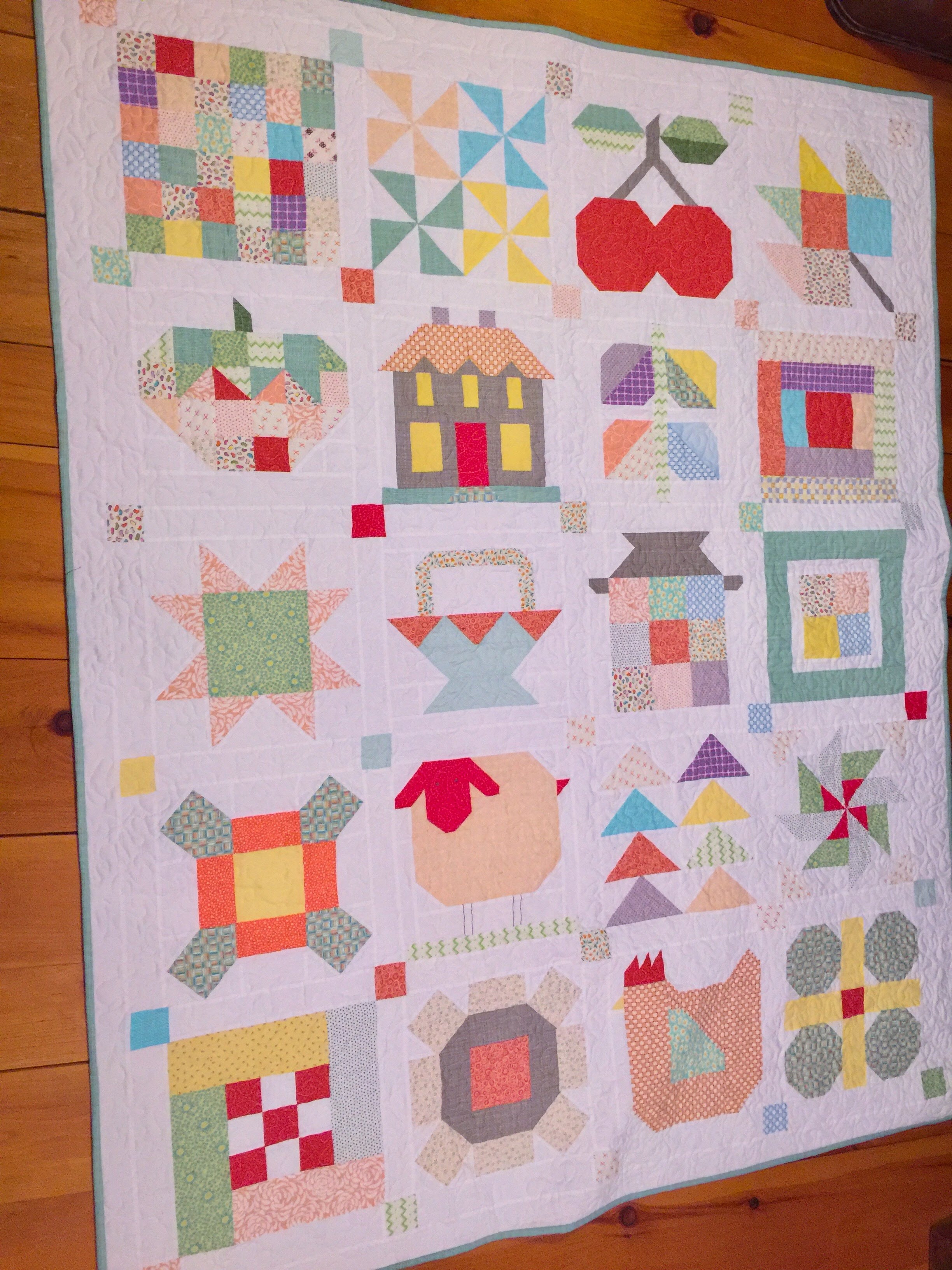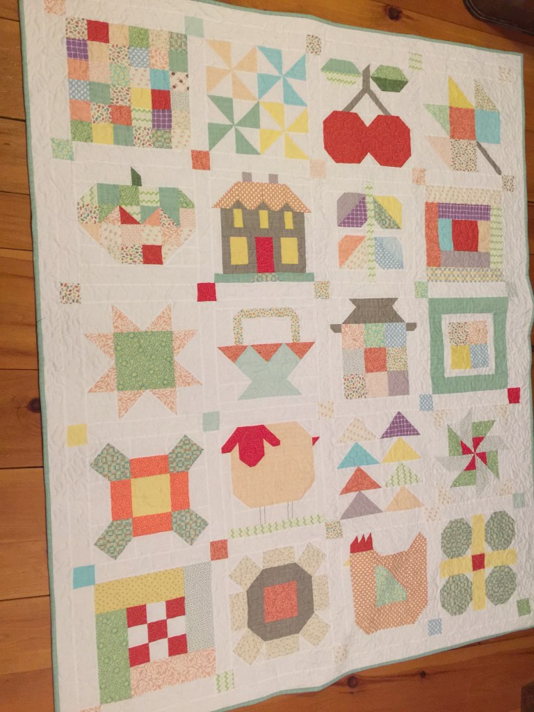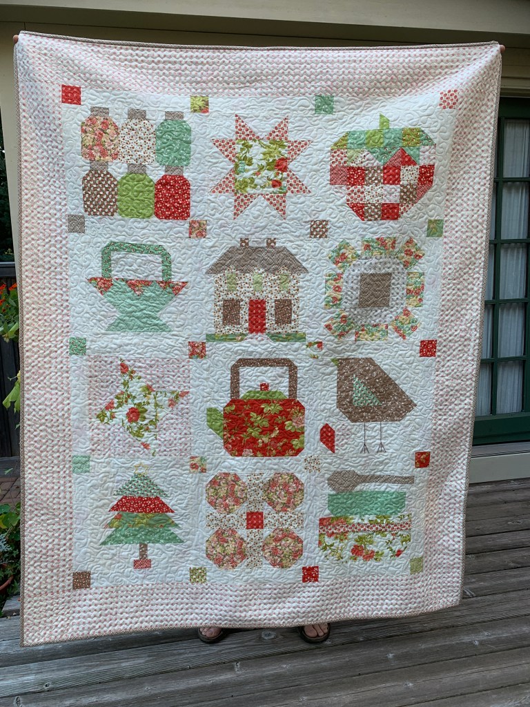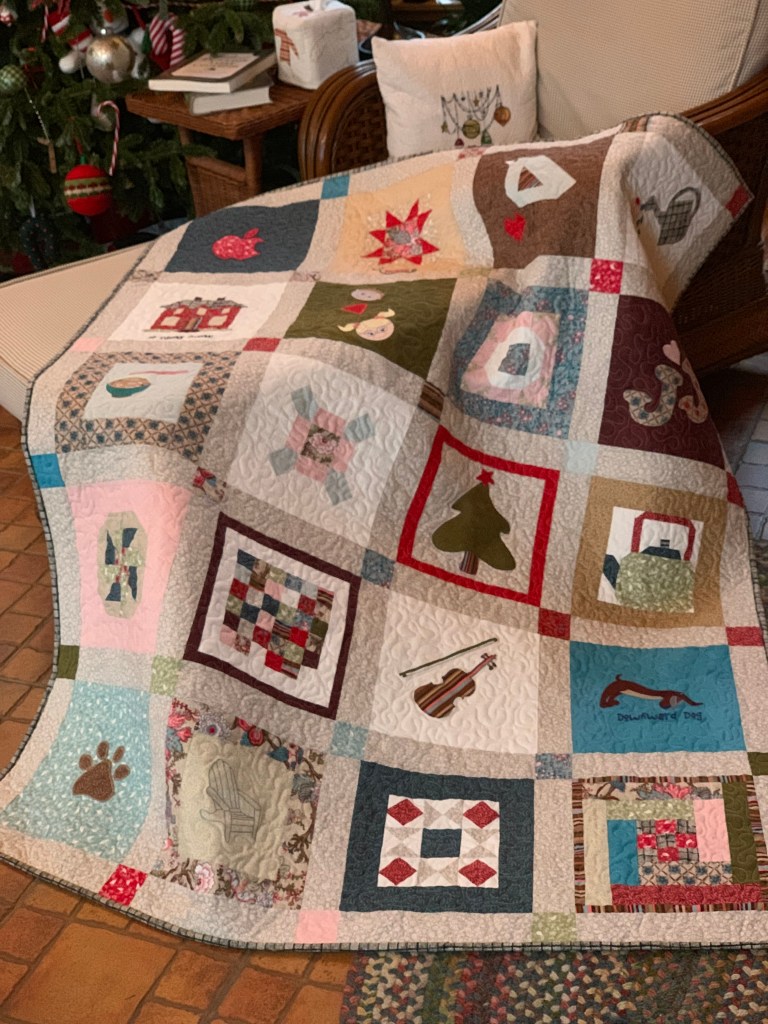 This one was a gift to my sister-like friend Sandra for her birthday. Like me, still is still grieving for Peg, so those memories are built into the blocks. Each block has special meaning for Sandra. Pst of the block patterns are from Lori Holt’s ‘Farm Girl Vintage’ book