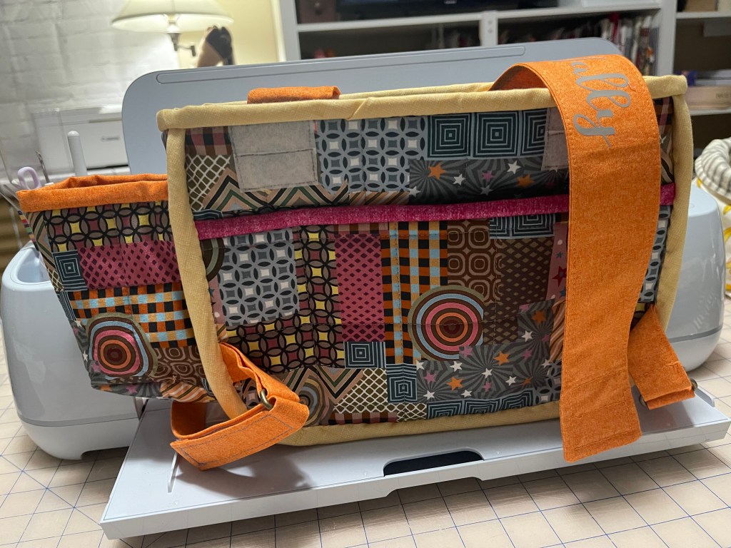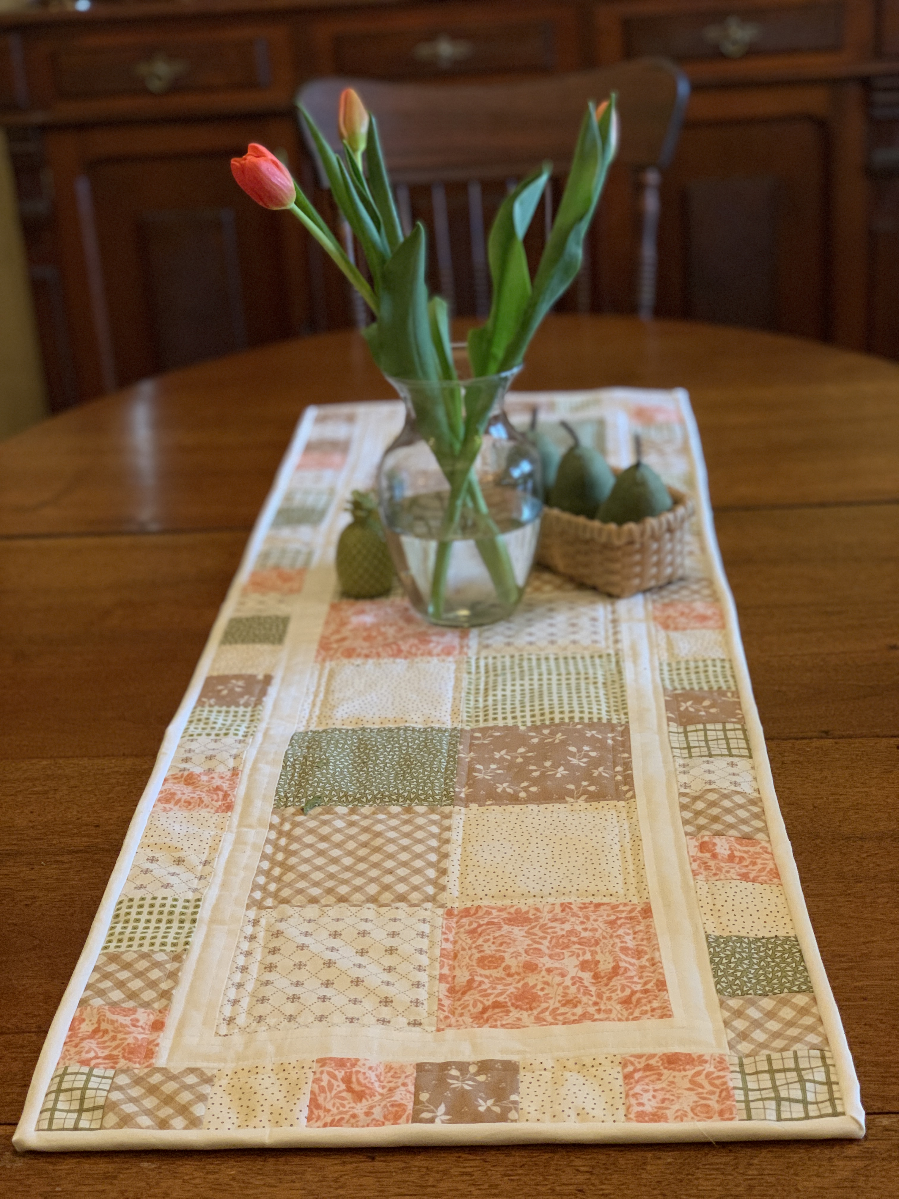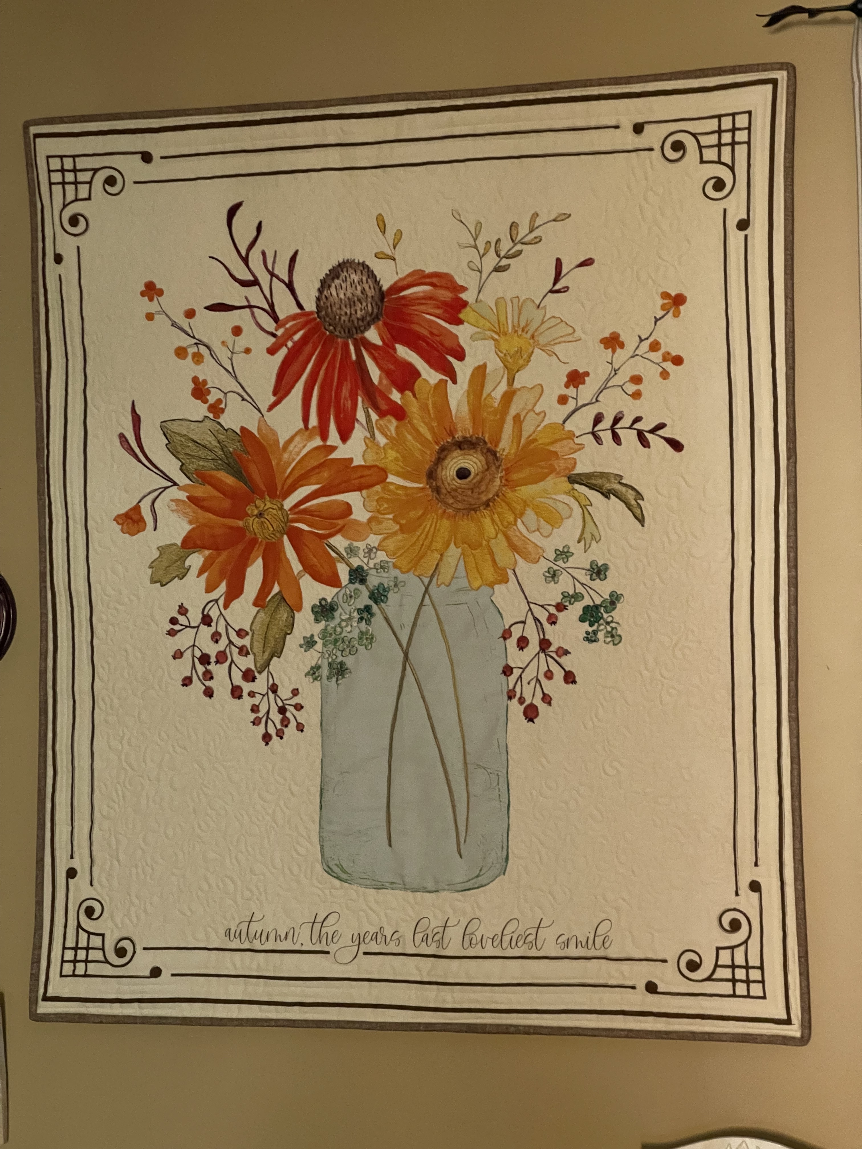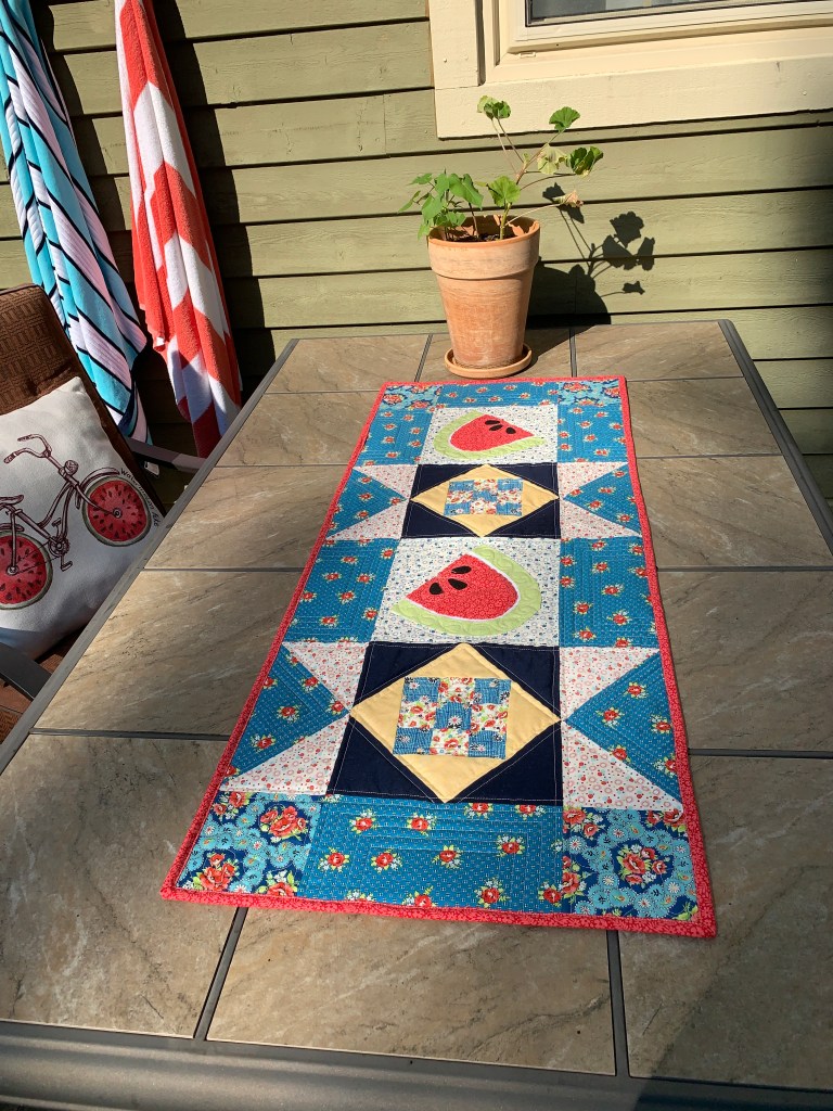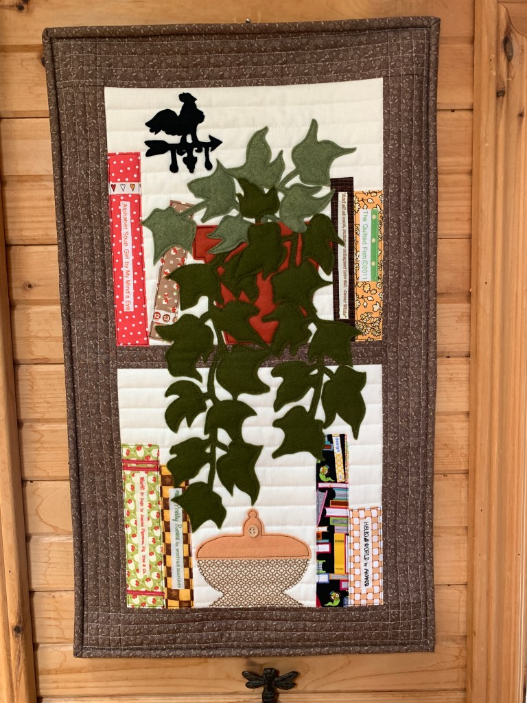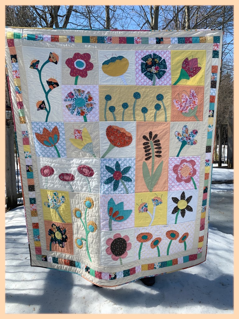My very best work, in memory of my best friend Peg who died of Ovarian Cancer in 2019. She loved flowers and this pattern from Shiny Happy World seemed fitting. The technique is turned appliqué. I gave it to her husband Pete who made a quilt rack for it and it now rests in his living room. There are tears on this fabric.