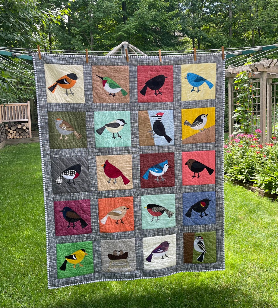 I can’t believe it’s taken this long for me to post. But better late than never. Maybe I wanted COVID to be gone first, but that’s not going to happen anytime soon, is it? So here is the whole story on the birds. It was all because of the pandemic. Which, by the way, and I hate to have to say this, I didn’t mind all that much. Why? Because deep down, I’m an introverted home body and I love my home and my sewing/playroom/workshop. So I am never bored and therefore always happy. During the pandemic I learned to love my backyard birds. Well, I should say I always loved them, but just paid more attention to them. A lot more. I got a telescope that year, just a small one and was able to see them up close right from my lounger in the Muscoka room. Binoculalrs were ok too, but with the scope I could attache my iphone and snap some photos. Quite cool. Anyway, I began to keep track of my pandemic birds, in my Peterson book. Then, as is natural, I began to think of how I could capture the birds forever in a quilted project. Shiny Happy World, one of my most favourite sites for fun patterns of all sorts, presented me with the basis for this one. Wendy is a brilliant designer. She put together a catalogue of bird body parts for 100 birds of North America’s east cost. I bought the book and was away to the races. I took my time (I had lots of it) and worked away to create 20 quilt blocks representing our own back yard birds, including some baby mourning doves who were hatched on our front porch, just 2 of many born at our house.