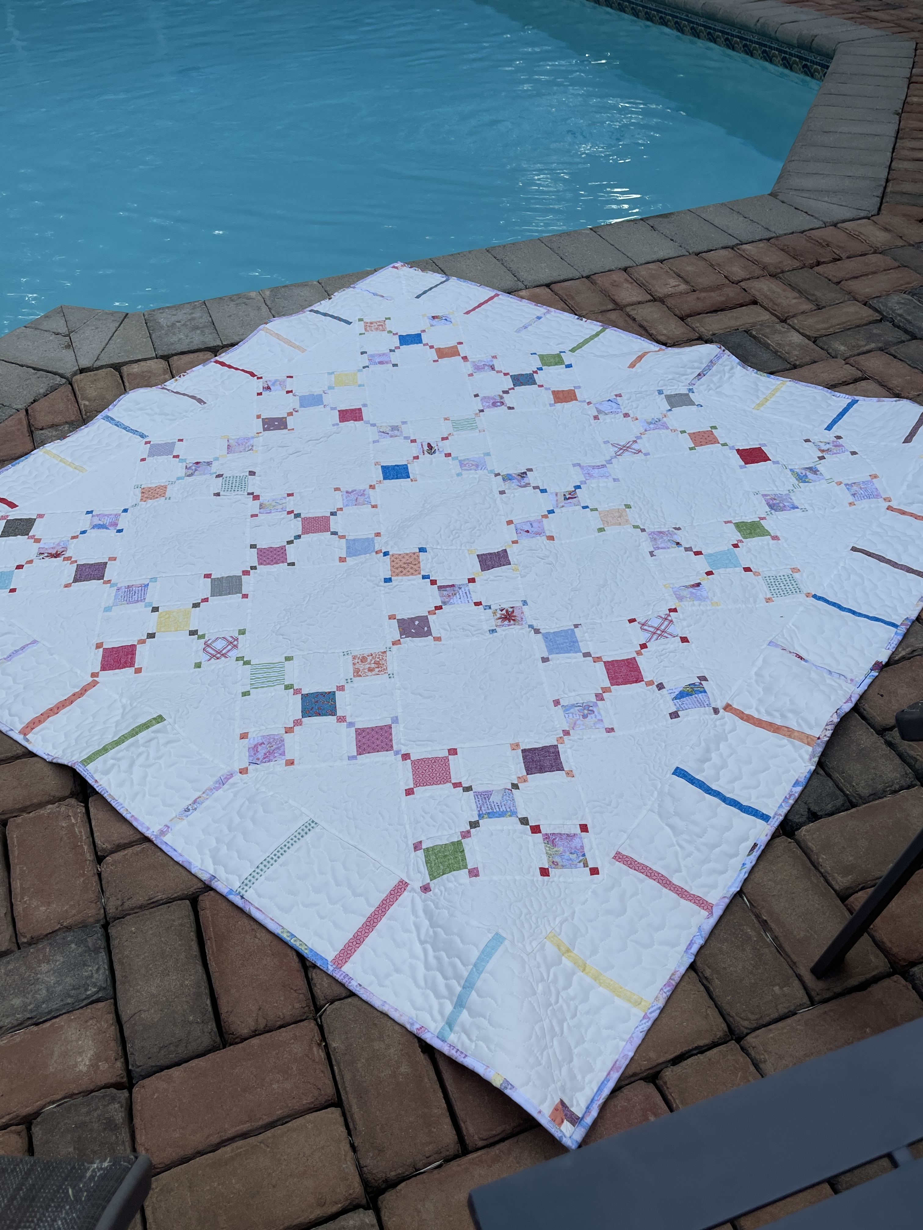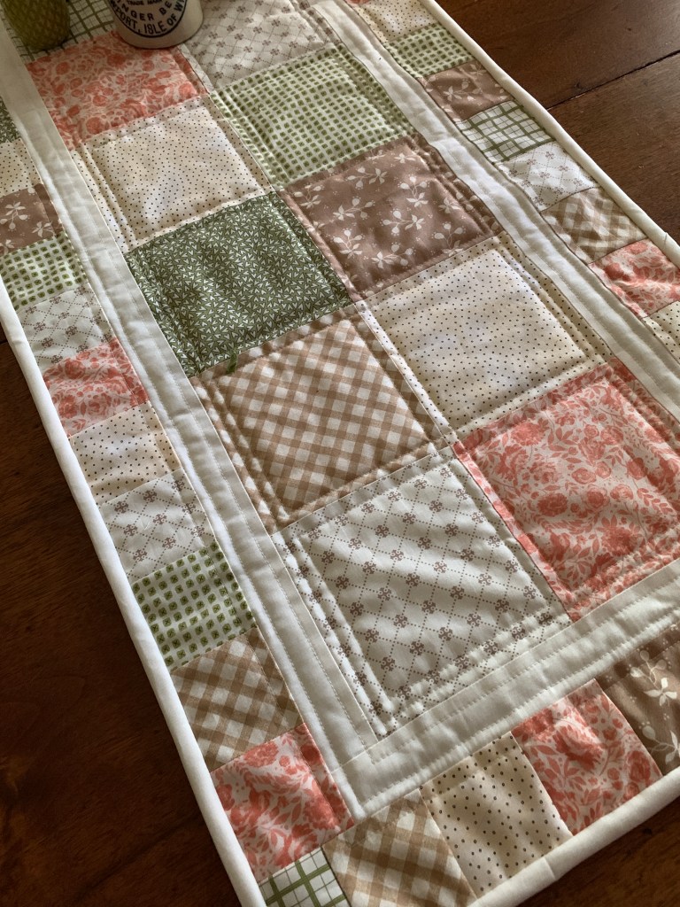 I saw this pattern at a local quilt store and couldn’t resist. It’s called Diamond Dust (a Lella Boutique pattern) The smallest squares are just an inch. I made my own piano key type border. It’s just lap size; about 60″ square. I love the summery, airy feel it has, while retaining its snuggle factor. I used a stipple stitch to quilt it. I do all my own quilting on just my regular Bernina machine but with its BSR (stitch regulator) which let me zoom around in free motion.