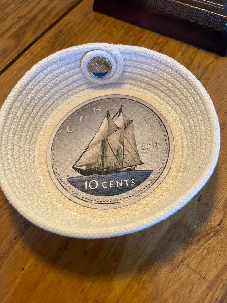 Here are a few bowls , but to begin with is one of my favourites, for Mark who loves the Bluenose. We sailed on her in 2019 on a visit to her home harbour of Lunenburg. For his bowl, I ordered the dimes from the mint and used one in place of a button for the embellishment. I think he likes it.
