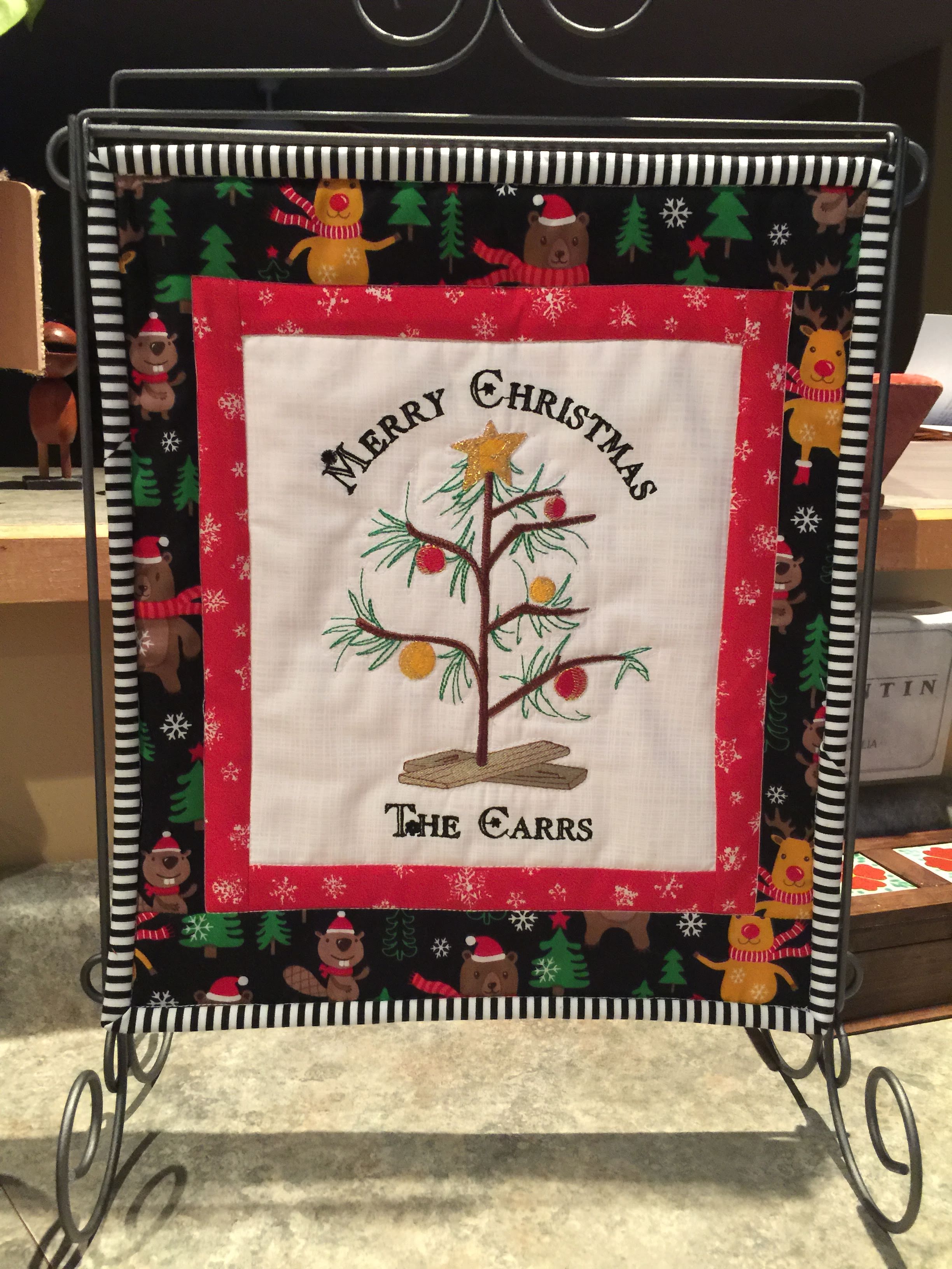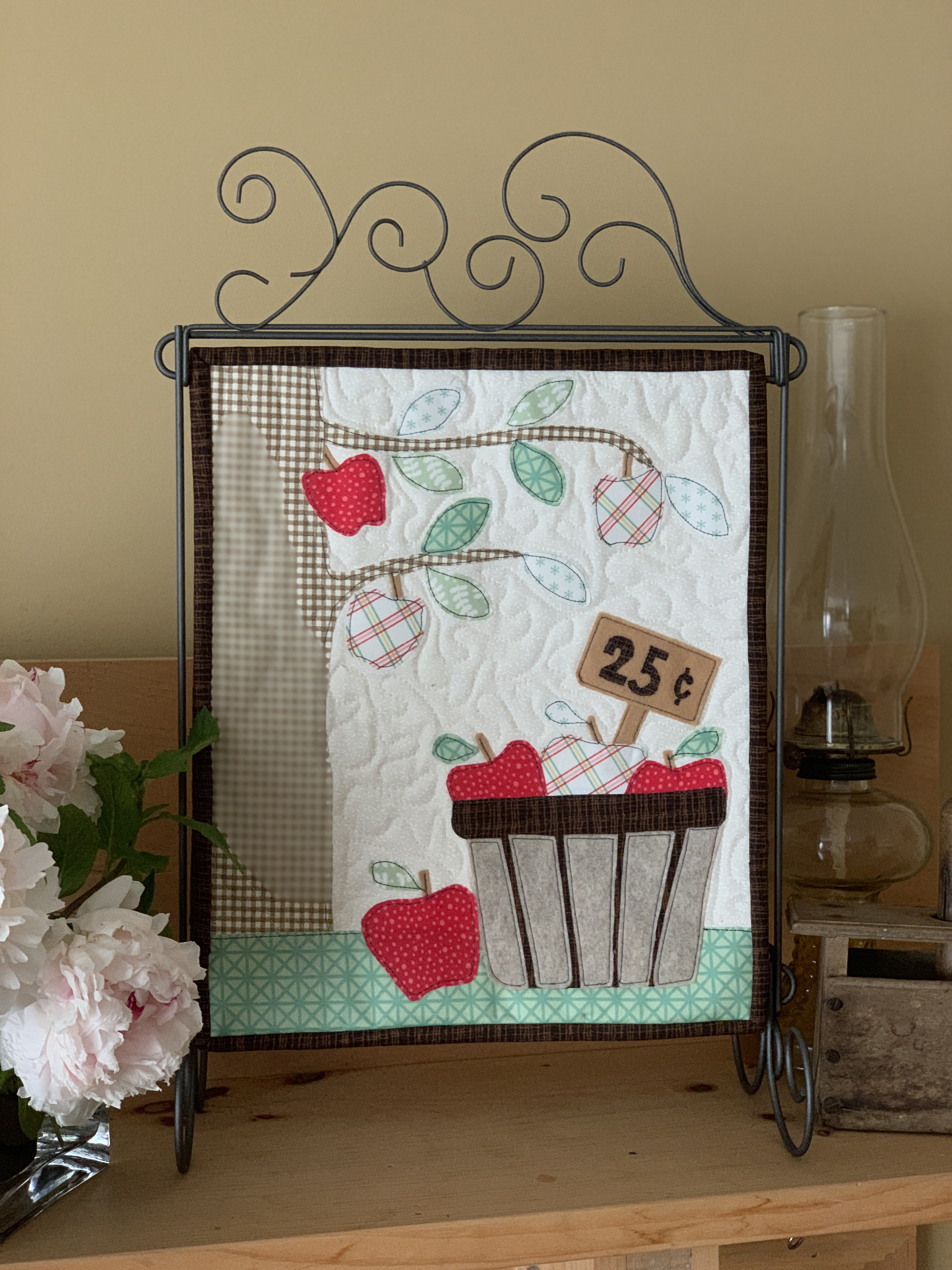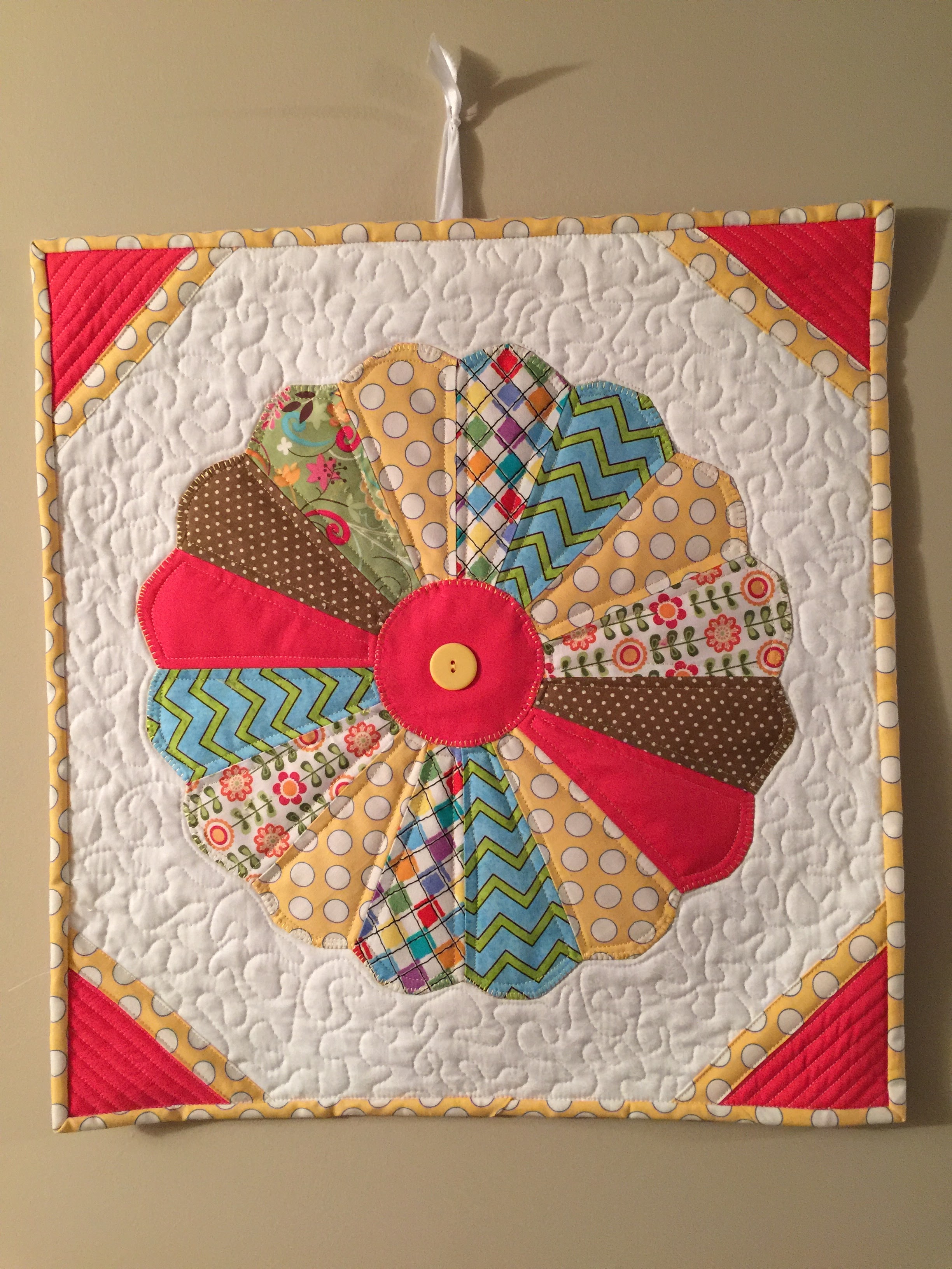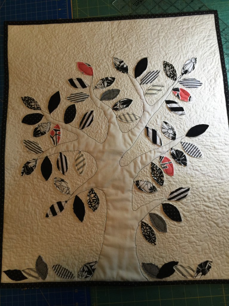 This lovely Cardinal wall hanging is made from a free pattern at Moda. This one is now hanging on the wall in my mom’s room at her nursing home. She loves birds and sewing and I think really loves this creation. I made all the stems from a very old package of dark brown bias tape she had in her sewing box which I inherited.