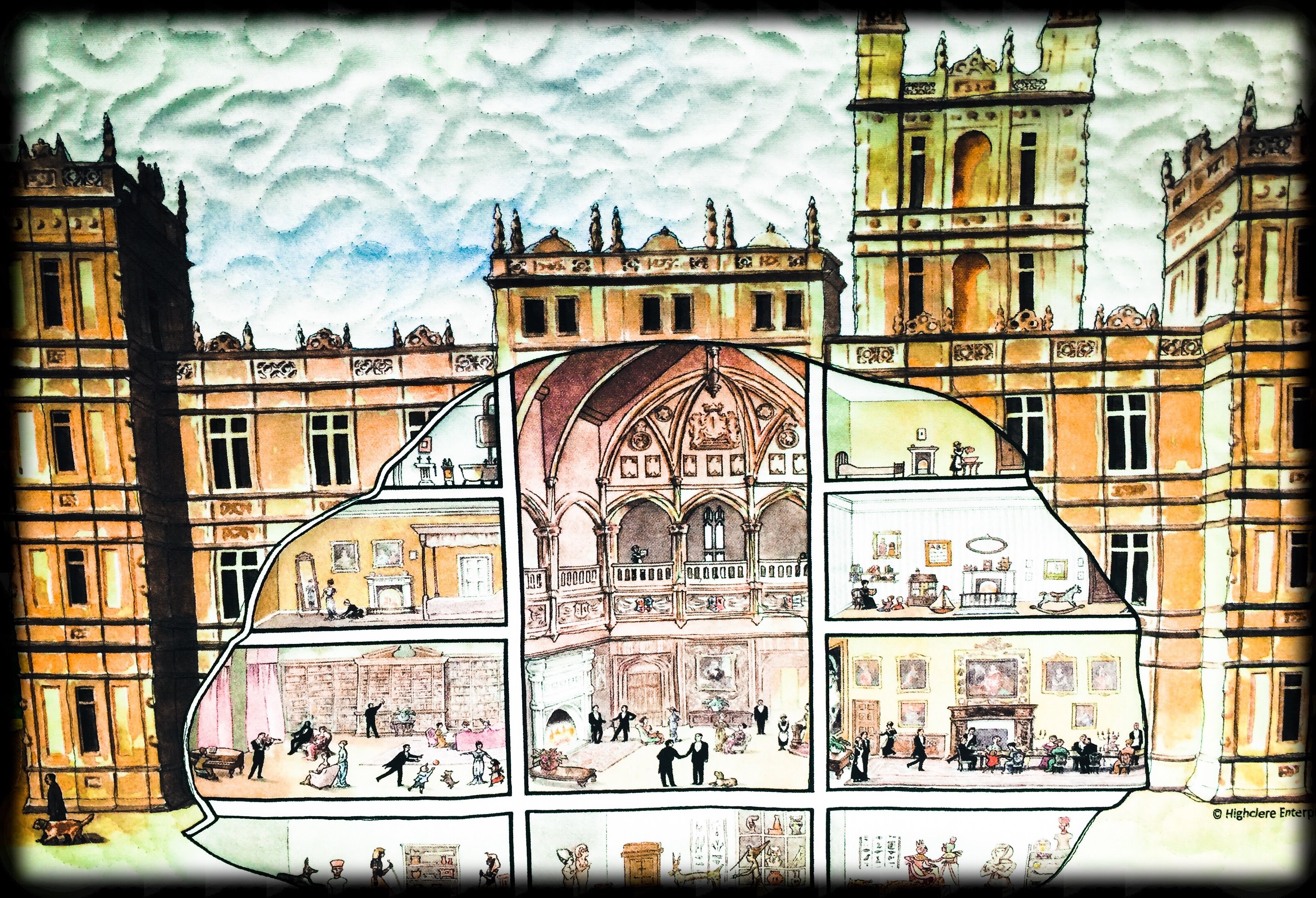 We had the pleasure of visiting Highclere Castle a few years ago…aka Downton Abby… and I brought home a souvenir tea towel and changed it into a quilted wall hanging. It hangs in my kitchen and I never get tired of looking at it. I think I see Bates.. do you?