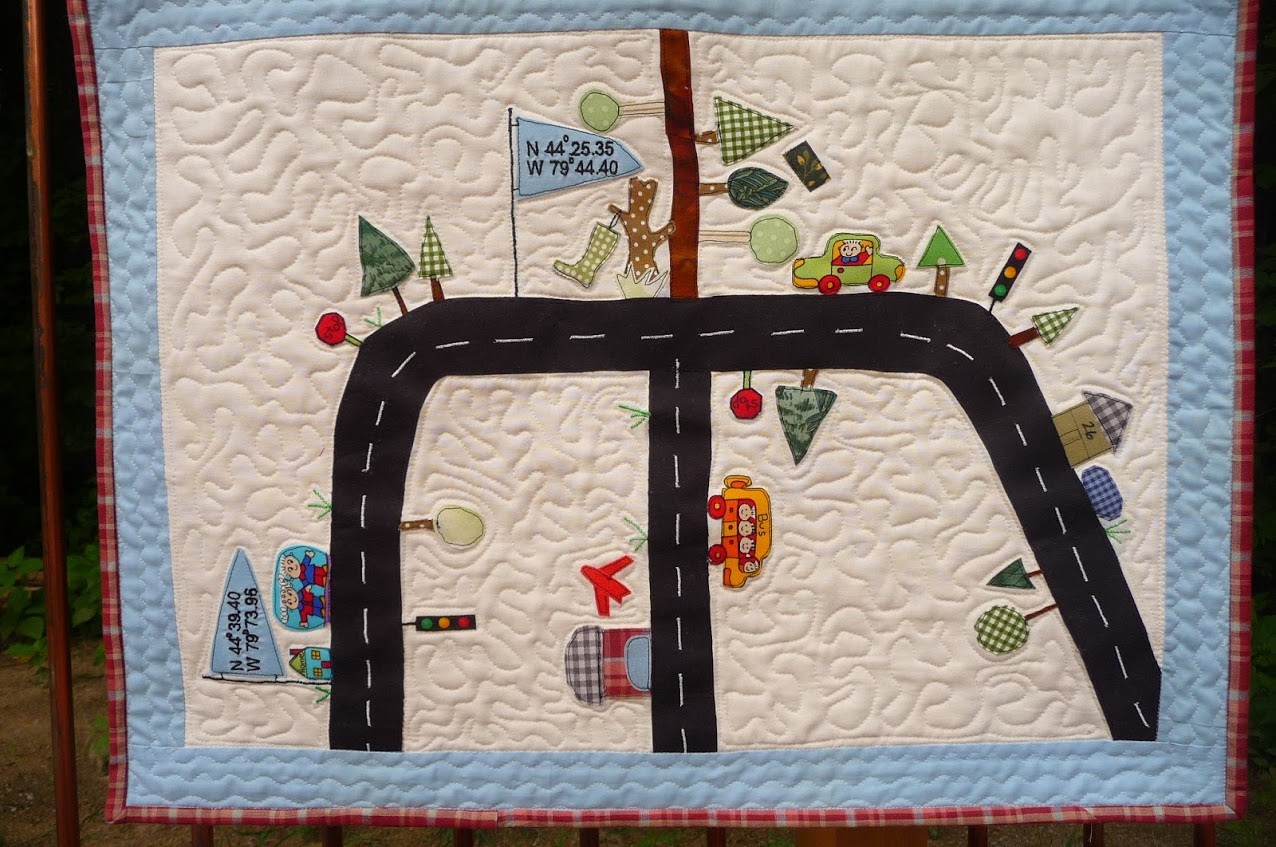 The special thing about this little house is that it is made with crayons! Colouring 101 on cloth, them ironed to set and quilted with black thread to outline the parts. I sewed the buttons on afterward. I love the simplicity of the whole thing.