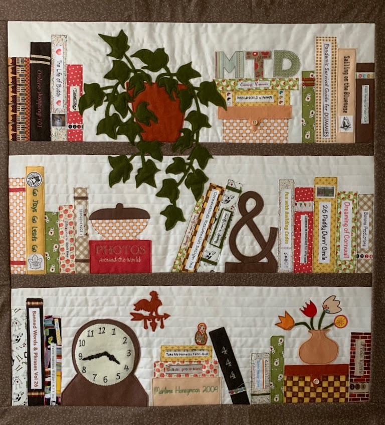 This is our favourite room because it is full of light and lots of plants and it connects us to the outdoors. Shadow especially loves it because the floor is heated. That is the hot tub in the corner which I decorated with a quilted bookcase wall hanging. It was so much fun to make that I made 2 more for friends, each with personal book titles and touches. The book spines are mainly salvage bits from fabrics (I always cut off and save the salvages on new fabrics) and a few others I embroidered. Zoom in to see the fun of it. Our clock is set to 4:44 because that is Mark’s special number
